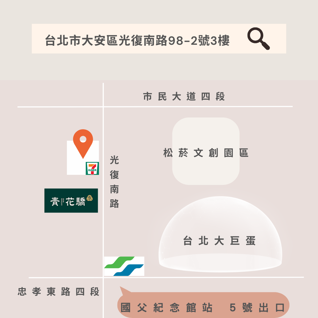 - 捷運國父紀念館站5號出口,步行約5分鐘